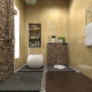 Selanjutnya ada desain kamar mandi yang tampak mewah dan hangat seperti pada gambar diatas yang cocok untuk kamar mandi berukuran luas. Dipadukan dengan elemen material batu alam, kayu, dan keramik glossy berwarna krem memberikan visual kamar mandi yang hangat.