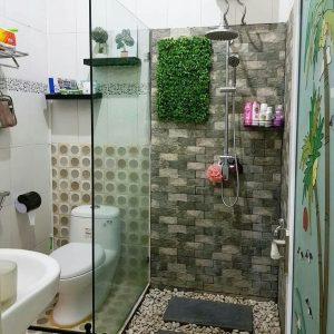 Dinding shower yang dilapisi keramik batu alam, hiasan tanaman hijau pada beberapa sudut ruangan membuat kamar mandi terasa segar.