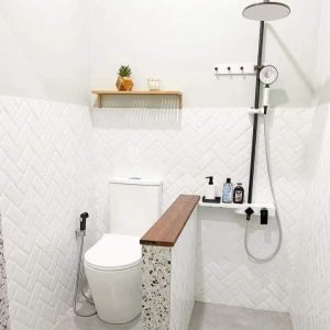 Elemen tambahan seperti dinding pembatas, rak kayu natural, hingga perabotan berwarna hitam doff memberikan kesan modern yang cantik. Model kamar mandi ini sangat cocok untuk ruangan yang sempit.