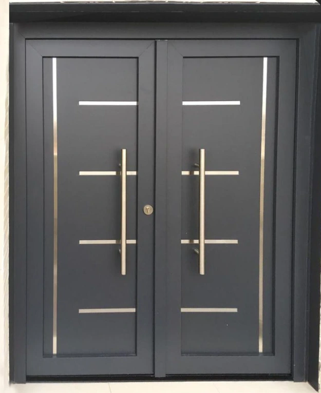 Model pintu aluminium 2 pintu pada gambar ini menampilkan konsep modern minimalis dengan nuansa elegan dan kokoh. Pintu ini menggunakan model double door dengan finishing warna abu-abu gelap yang tampak tegas.