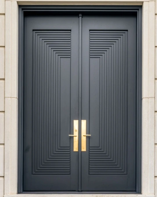 Motif ini menambah nilai estetika pada pintu sekaligus memberikan kesan tegas dan terstruktur. Kombinasi warna hitam dan emas pada handle pintu, serta motif geometris ini membuat pintu tampak sangat eksklusif.
