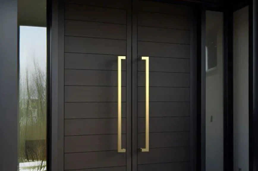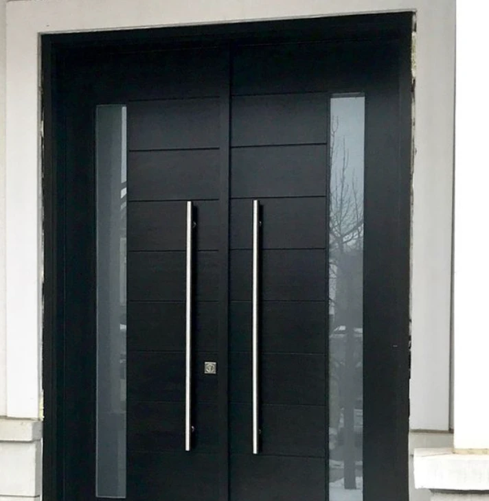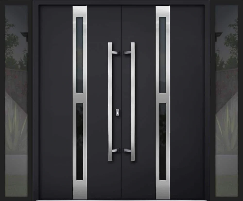 Kedua sisi pintu dilengkapi dengan kaca vertikal panjang yang berfungsi sebagai pencahayaan alami sekaligus menambah nilai estetika. Handle pintu dibuat dengan model lurus dan panjang berwarna silver metalik, memperkuat kesan modern dari pintu.