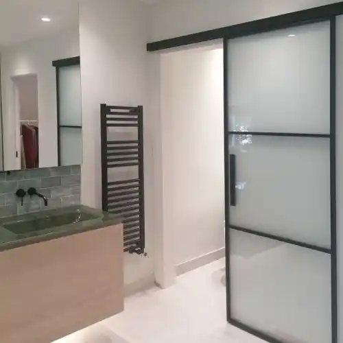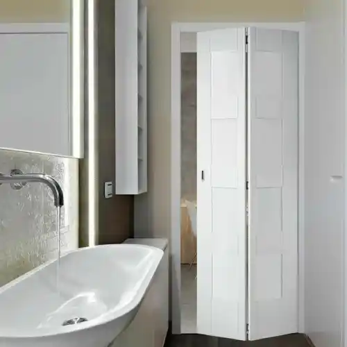 Selanjutnya ada pintu kamar mandi model geser yang dapat menjadi solusi ideal untuk kamar mandi dengan ruang terbatas. Dengan desain simpel dan modern, pintu ini dapat dilipat ke satu sisi, memaksimalkan area yang tersedia tanpa mengganggu tata letak ruangan.